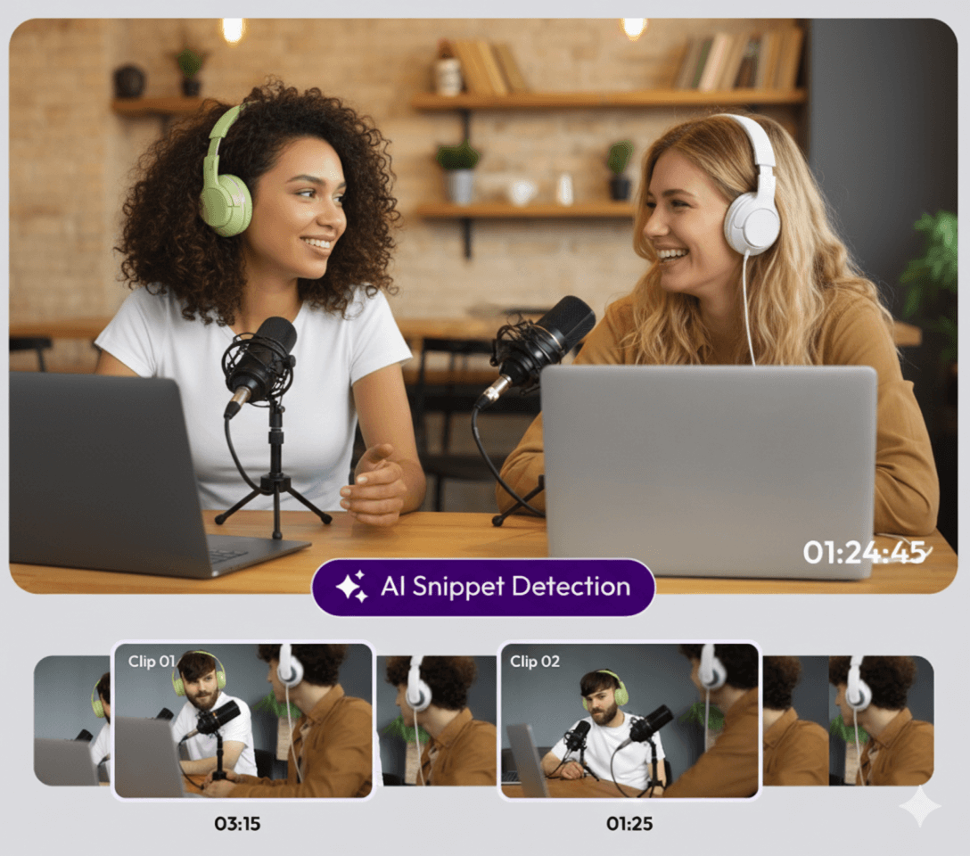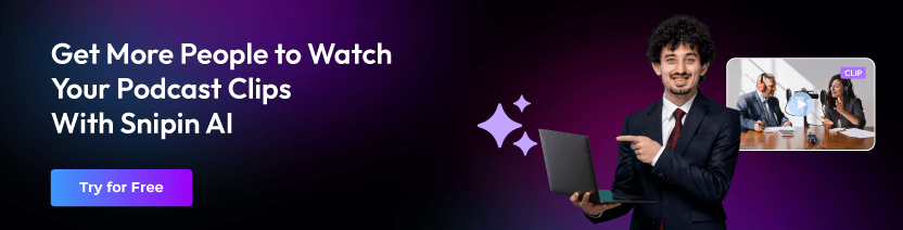 In AI podcast content repurposing, an AI video summarizer for podcasts like Snipin AI plays the editor's role. It looks at podcast recordings, finds the best bits, and turns them into podcast clips for social media. They are formatted and sized in a way that's appropriate for social media posting. Snipin AI watches speakers' movements, expressions, and emphasis. This way, it detects the noteworthy moments in a full-length recording and generates podcast engagement clips, just within a few minutes.