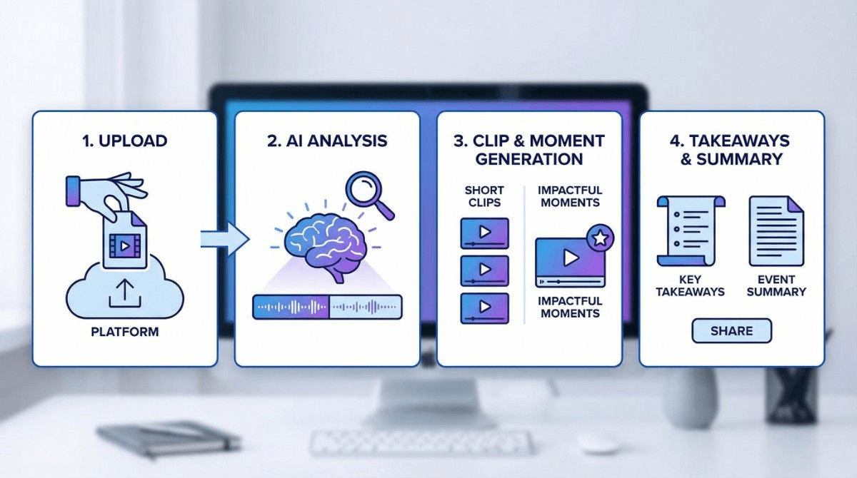 Snipin AI is Dreamcast's smart AI that changes how you use event recordings. It makes your long event recordings into short, shareable content. It pulls out the highlights from these recordings. You also get a concise summary of your event. All this information is put on a special event microsite made just for you and your attendees. Now, let's check out how Snipin AI works.
