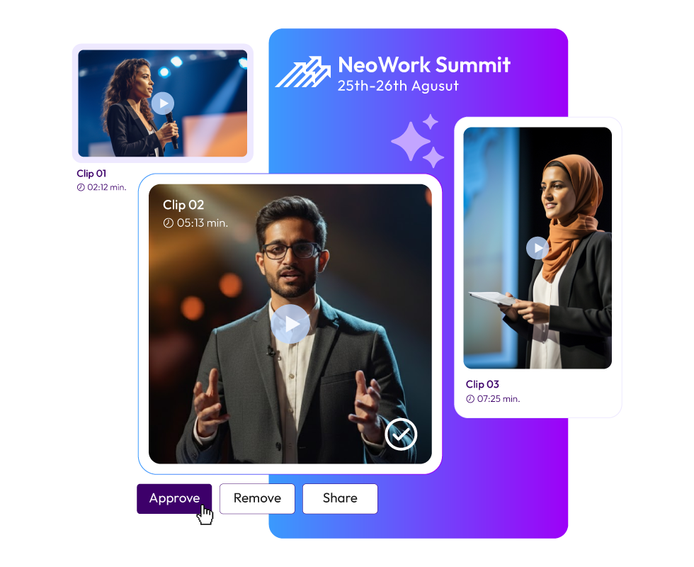Let AI do the rest. Turn your event sessions into short, scroll-stopping videos. Create summaries and takeaways that spark conversations. Share your best moments across platforms effortlessly.
