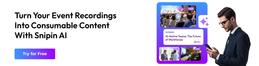 The most important thing is instant sharing. You can share hand-written recaps, too, but for that, you'll need a week or two. But an event video summarizer tool like Snipin AI can give you quick summaries in minutes! Instead of waiting days, your team can share short post-event video summaries and takeaways the same day! Just upload the recordings, and Snipin AI creates content that's easy to share. The result is that more people get interested, and your content gets out there more. Since short summaries are easier to take in, people are more likely to take notice and engage with your event. A decent event video summarizer tool lets you reuse your whole event in a way that’s easy to share. Using a tool like this makes things faster, improves your content, and gets it to more people. When you share video summaries right after an event, you keep the excitement going and spread your message even after it's finished.