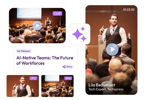 Our conference video summarizer generates AI-powered highlights within minutes of uploading your recordings. Event teams can share clippings during or immediately after the session, perfect for real-time engagement and sponsor visibility.