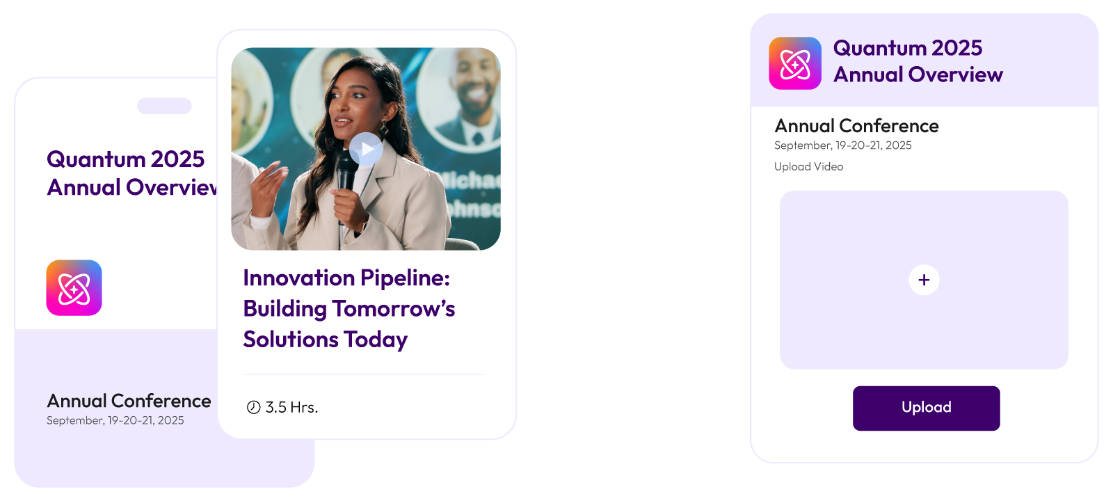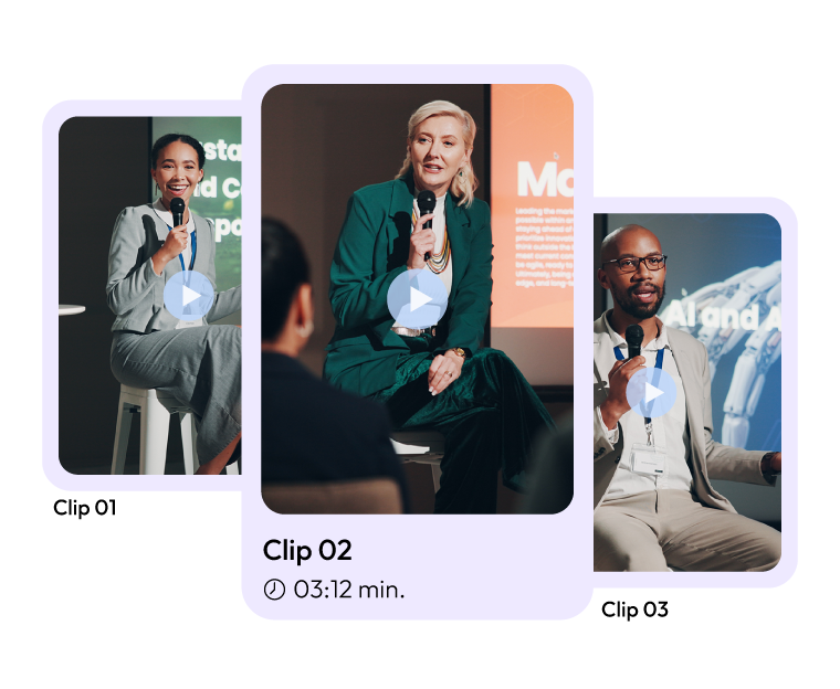 Upload your event recordings and get tailored highlights, summaries, key takeaways, and multiple clips, all ready to share.